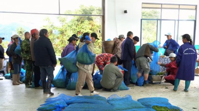 【国茶村茶农将当天采摘的茶叶送到茶厂,现场茶农络绎不绝】